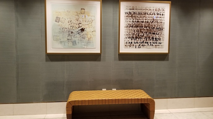Fitness Center terletak di lantai enam. Kita akan naik elevator untuk mencapai ruangan Fitness center ini. Di depan elevator disediakan bangku berwarna emas dengan dua lukisan yang tergantung di dinding.