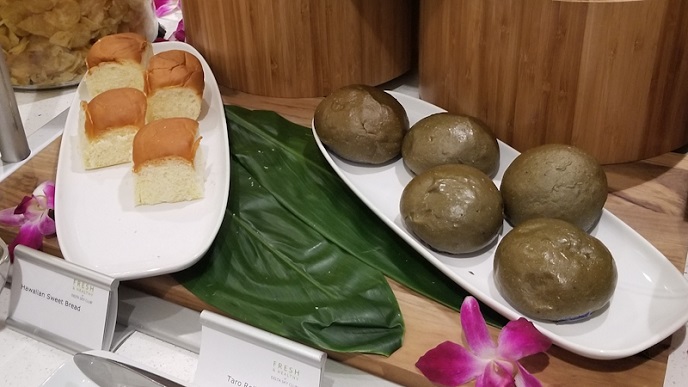Yang menjadi perhatian saya di meja makanan adalah roti yang khas Hawaii. Roti putih ini desebuat Hawaiian Rolls dan yang satunya lagi adalah roti taro ungu dan juga roti pita kecil. Bunga anggrek ungu ditaburkan disekitar meja makanan.